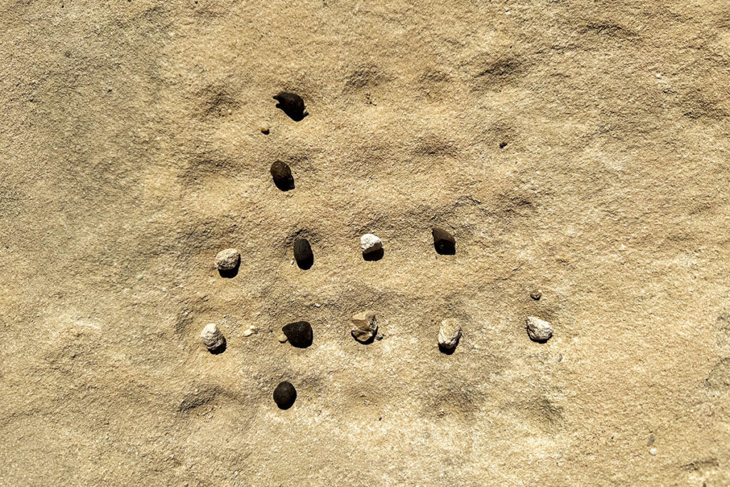 In the Nabataean context, boards were discovered at sites such as Petra, Little Petra (Siq al-Barid), and Sela, carved directly into rock surfaces, stairways, or flat courtyard stones. Typically, the boards feature two parallel rows of six to seven small cup-like holes, sometimes with a larger storage hole at either end — a design nearly identical to the modern Mancala or “Al-qirkat” games still played in parts of the Middle East today.